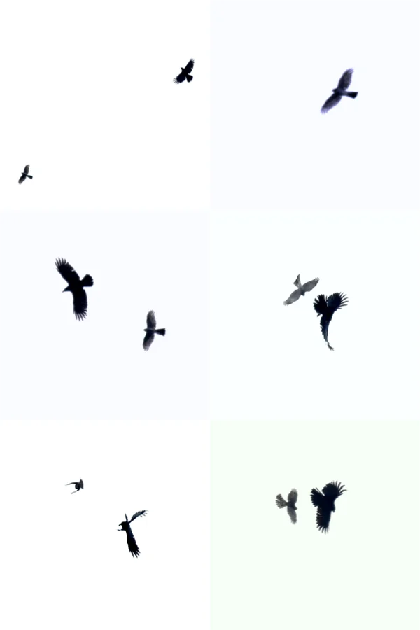その姿を追っていると、ハイタカも飛んでいるのに気づきました。そこにモビングをしかけるハシボソガラス。ハイタカの反撃のほうが勝っているように見えました。