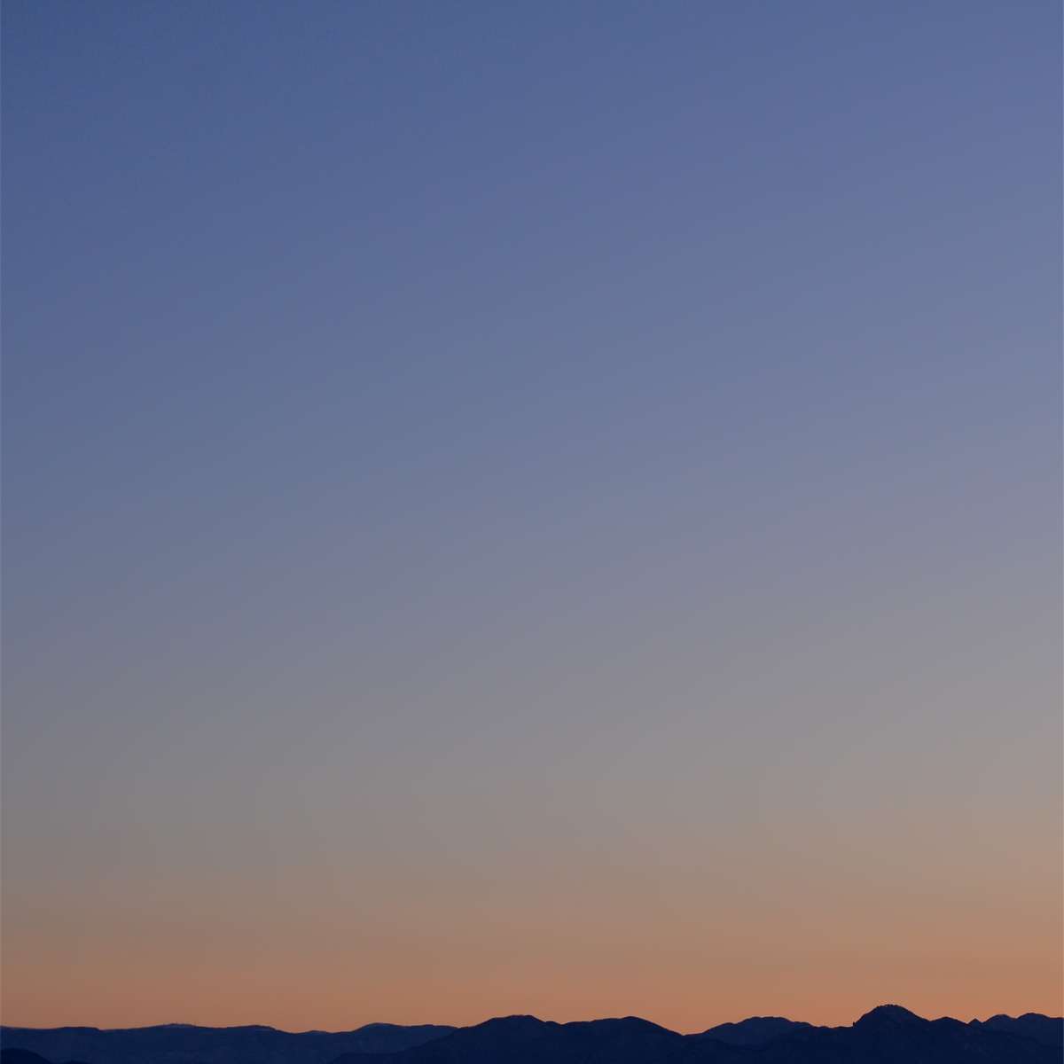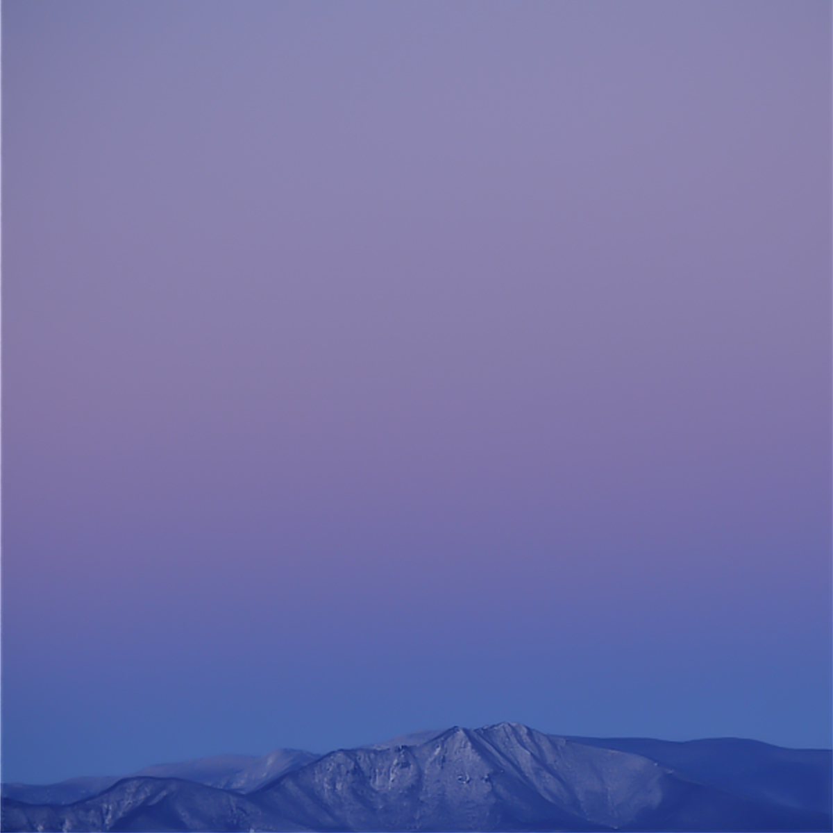 この写真は、根子岳からやや北に見える志賀の山々、この場所からはほぼ真東の眺めです。すでに残照は消えて、だんだん暗くなり、市街の光が目立つようになった時間帯です。山の端の空が少し青く色づき始めているのがわかります。地球影の始まりです。